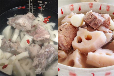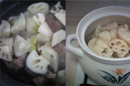 烧开后,打开锅盖,将切好的莲藕顺势倒入锅中,然后将锅盖盖严,调至大火煮开后再调成小火,保持微沸状态炖就行了,一般炖上一个小时左右。等排骨汤炖熟后,就把火关掉,捞出汤里的生姜和大葱。然后再放一点胡椒粉和盐即可。在做的时候一定要注意,莲藕里面的泥沙是非常难洗干净的,在买的时候要选择两端藕节均完整的,洗的时候要多洗几遍。