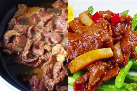 锅里的油还可以再用,需要再添加一点油在里面,就可以把腌制好的牛肉倒进去翻炒,待牛肉炒成八分熟时,就可以盛出来装在盘子中。然后把锅洗干净,再烧热,倒入适量的油,将葱姜蒜和红辣椒倒进锅中炒香,再把之前炒好的牛肉倒进锅中翻炒均匀。我们把调制好的沙茶酱倒入锅中翻炒均匀后收汁,把空心菜饭放在盘子,再把炒好的沙茶牛肉倒在空心菜上。