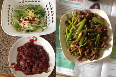 第五步,芹菜大概炒了五分钟之后放入牛肉,使之和芹菜充分混合,至锅中材料变色即可起锅。想让味道更香的还可以在起锅后淋上芝麻油。一盘色香味俱全,营养丰富的家常菜就大功告成了,保证你一吃就停不下来。