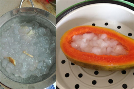 第二步:我们就把泡开后洗干净的雪蛤放进去木瓜里面,把盖子盖好,紧接着,就直接拿整个木瓜去炖,只需要炖二十分钟就可以了哦,这个营养高又好吃的木瓜炖雪蛤就大功告成了,是不是很棒呢?大家一起去试试做木瓜炖雪蛤把。