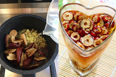 下面,我们来学一学枣茶和梨茶的做法。枣茶,先把红枣洗干净,然后切成两半,这样味道比较容易出来。喜欢完整一颗的话,煮的时间会久一点。然后,将茶叶和红枣放入温水里,煮到有红枣的香味溢出。枣茶可以预防心血管疾病,而且有健脾开胃的作用。