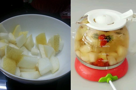 梨茶,先把梨去皮然后切成小块,然后和茶叶一起放进沸水里煮半个小时左右。可以适当地加一点冰糖,调调味道。梨茶对我们的嗓子有益处,而且有助于消化。
