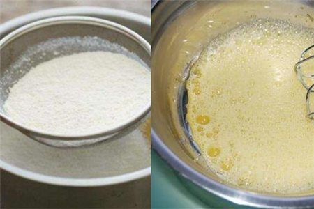 先将低筋面粉、玉米淀粉和泡打粉用筛子过滤一下,这样可以去除比较大的面粉颗粒,制作出来的作品口感更佳。把过滤好的粉料放在一边备用。