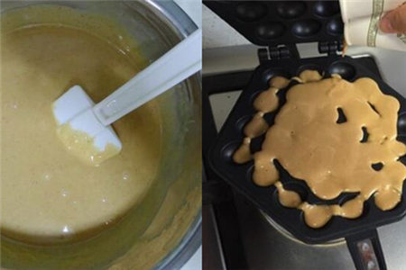 搅拌好的面糊先静置半个钟头,让面糊中的气泡慢慢减少。用刷子在鸡蛋仔模具的两面都刷上一点植物油,将面糊倒入到鸡蛋仔模具中,开启加热。等模具开始加热以后立马反转。