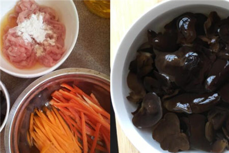 把木耳、里脊肉、冬笋、胡萝卜这四样材料都用水冲洗干净切成细丝。红辣椒、姜片、大蒜剁成细末。里脊肉丝需要腌制一下,放入盐、料酒、蒜末和姜末。用手将腌料和肉丝抓匀,方便入味去腥。