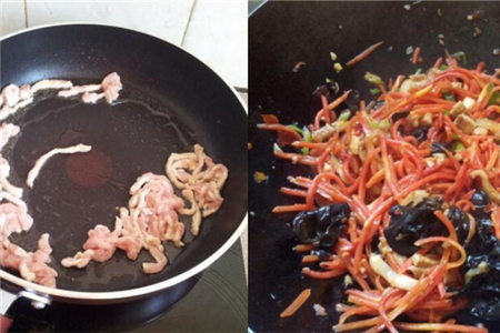 锅中放入大豆油,开中火加热。放入肉丝先爆炒出香味,接着将笋丝、萝卜丝、木耳丝、红辣椒一起下锅。这些材料都比较的易熟,所以整个烹饪的时间要掌控在5分钟左右,时间太久食材的口感就会变差,外观颜色也不好看。
