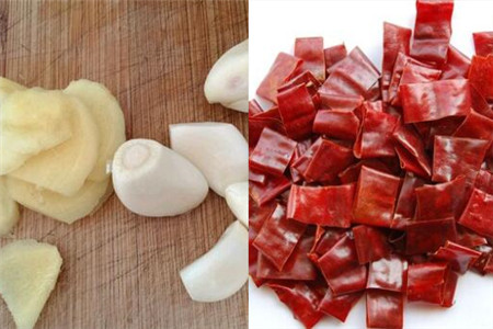 我们先把姜和蒜都全部切成片,然后放在碗里面备用,因为我们要做的是香辣虾,所以还要准备大量的干辣椒,把辣椒全部洗干净之后切成段,同样放在旁边备用。在锅里面多放一点油,在油温度较高的时候再把其他的佐料全部倒进去翻炒,我们要多放一点盐。