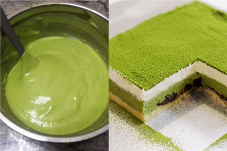 把全部都弄好之后,就把适量的抹茶粉倒进去,搅拌均匀之后,整个液体就会变成抹茶的颜色,抹茶粉不能够全部倒完,因为等一会儿我们还要使用。但为了让抹茶液体成型,我们同样需要把它放在冰箱里面去冷冻,等待它完全成型之后再拿出来。