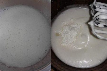 这个时候我们就需要用到专门制作慕斯蛋糕吉利丁粉,把吉利丁粉倒入纯牛奶里,让它们搅拌均匀。这个时候我们再把它倒入刚刚的酸奶里面,把它们搅拌均匀,如果刚刚我们还有剩余的奶油,就把奶油也倒在里面,如果没有的话还要重新制作奶油。