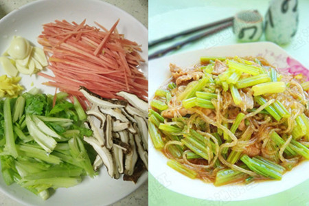 芹菜除了清炒作为主食之外,还能和面条、粉条等一起炒做成午餐。