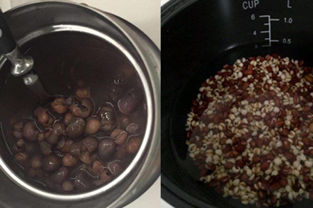 step1.准备好质量相等的红豆和薏米。随后分别对红豆和薏米进行处理。将红豆浸于清水中洗净,然后将其浸泡两三个小时左右。同样洗净薏米,然后将其置于清水中泡一个小时。