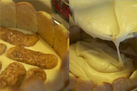 将马斯卡彭和剩下的白糖也一起加入其中,慢慢搅拌。这样芝士糊也完成了。下面只需要在模具中先铺上一层手指饼干,刷上糖酒液。