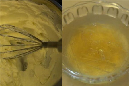 接着就是制作芝士糊了,先把马斯卡彭进行融化,搅拌均匀。将吉利丁用冷水泡软,鸡蛋我们只用蛋黄。将蛋黄放在热水上(50度左右)搅拌,等蛋黄慢慢变成粘稠状停止。放入泡软的吉利丁和淡奶油,继续搅拌。这个过程中要一直保持着水温。