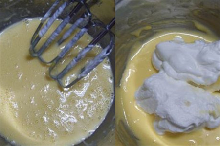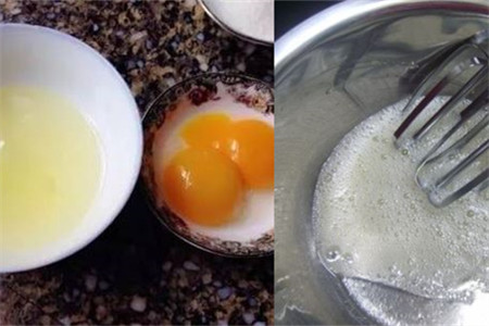 我们先准备两个干净的碗,把鸡蛋的蛋白和蛋黄分开装。用打蛋器把蛋白打至出泡,然后再加一点白糖,分三次加,每次都要搅拌均匀。糖全部加完后,就快速的搅拌,也要搅拌出泡为止。我们在蛋黄中加入适量的牛奶,然后搅拌均匀。然后准备一个筛子,把面粉筛经进去,搅拌均匀为止。我们再把搅拌好的蛋白放三分之一进去,搅拌成蛋糊。
