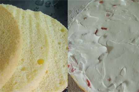 我们把之前烤好的蛋糕切成三片,取一片蛋糕放在蛋糕盘上,然后在蛋糕上抹上一层奶油,放一点水果,再抹上一层奶油。第二层是用同样的方法,然后再把第三片蛋糕放在上面,加点奶油,然后抹均匀,再摆一点水果,水果蛋糕就完成了。在制作过程中,特别是在烤面包的时候,一定要注意不要把蛋糕烤糊了,要注意烤温。