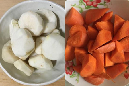 7、新鲜的白萝卜削去外皮,洗净后用的切成小丁状。高压锅泄压后,把胡萝卜丁加入其中,撒上些食盐调味,再盖上盖子小火继续炖煮半个钟头,就可食用了。
