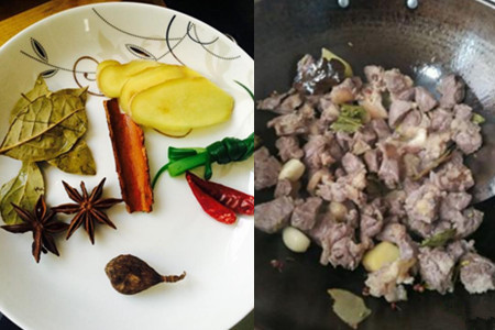 4、将生姜切成厚片,八角、桂皮、草果、香叶放在清水中清洗干净,再捞出控水待用。