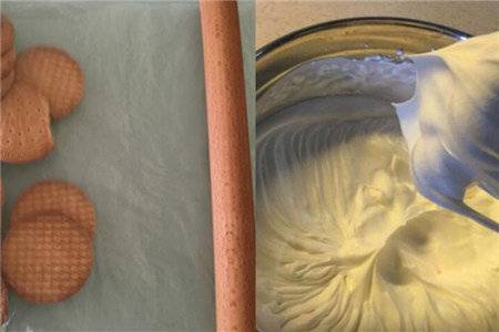 先把消化饼干和奥利奥饼干用料理机搅拌成碎屑,如果没有料理机的话那就需要人工制作了。不过也不会很麻烦,准备一个保鲜袋,把饼干尽量掰碎装入袋子里。用擀面杖反复碾压,直到饼干全部变成粉末为止。注意奥利奥饼干需要去除当中的奶油夹心。