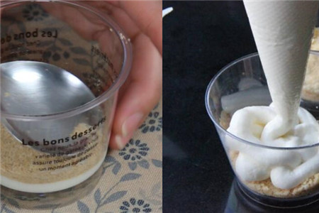 取一个塑料杯子(木糠杯专用模具),先在底部铺上一层消化饼干屑。用裱花袋挤上一层奶油,挤的时候由外向内画圈。