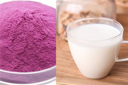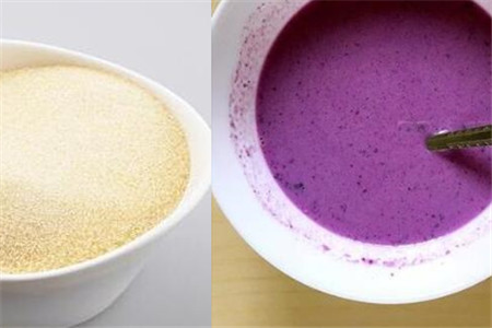 其实我们做很多的甜品都会用到吉利丁粉,所以如果喜欢在家里面做甜品或者是蛋糕的人,家里面都应该常备有吉利丁粉。把吉利丁粉和纯牛奶搅拌均匀之后,再把它倒入刚刚装有紫薯粉的碗里,然后再次搅拌均匀。