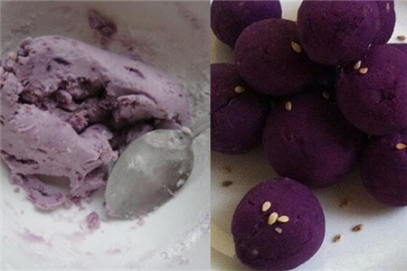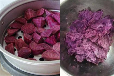除了做非常好看的紫薯布丁以外,我们还可以利用营养丰富的紫薯制作紫薯球,但是做紫薯球就必须要用到新鲜的紫薯。我们需要把紫薯削皮之后,把它切成很小的块儿,然后放在蒸笼里面将它蒸熟,然后把紫薯弄成紫薯泥。
