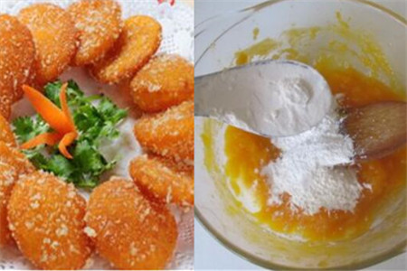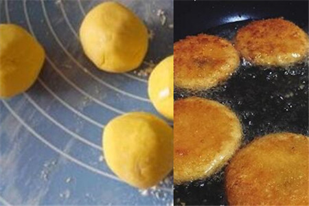 把它们搅拌均匀之后放在一旁,先要把锅烧热之后再倒入适量的油,在油温适中的时候,用手将南瓜饼泥揉成圆圆的球之后压扁,然后把它放在油锅里面去炸。如果不是喜欢吃很油腻食物的人,可以在锅里面少放一点油,用煎的方法来制作南瓜饼。