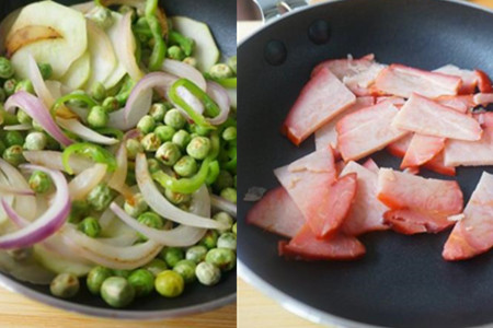 青椒和洋葱清洗干净,切成细丝。西葫芦削掉外皮,切成薄片。大火烧热炒锅,放入少量黄油加热至融化,将洋葱丝、青椒丝、豌豆和西葫芦片下锅煸炒,炒至半熟后装盘待用。火腿切成大小合适的片状,放入炒锅煸炒,炒出香味后盛出锅待用。