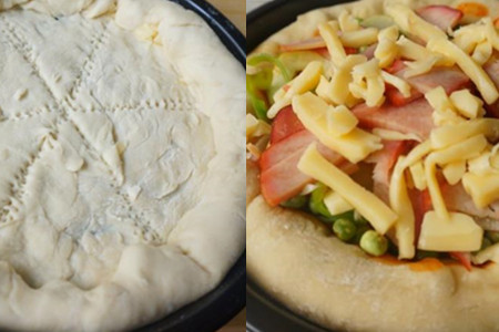 用叉子在披萨底部戳出小孔和器分割线,再取适量番茄酱和披萨酱抹在披萨底部,然后放上炒好的蔬菜和火腿片,撒上剩下的芝士条,放入烤箱中层,调至200度烤制20分钟。用叉子在披萨底部戳出分割线,是为了方便烤熟之后将披萨分割成小块。在底部戳出小孔,是为了避免面团中的空气膨胀。