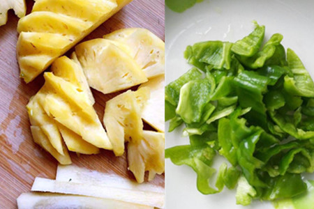 1、准备的食材有菠萝、排骨、番茄沙司、青椒。