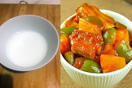 6、在一个小碗中,加入些淀粉,用清水将其溶解。把水淀粉淋入锅中,翻炒均匀使锅中的食材充分地入味。这时候便可出锅食用了。