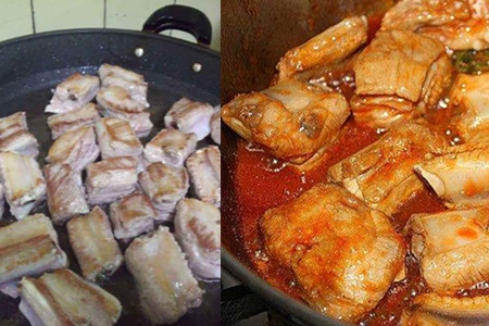 5、加热干锅,这时候再把排骨下入锅中,中火煎至排骨微微焦黄。紧接着把些许的蚝油和清水倒入炒锅中,水量不用太多,只需要到排骨的一半即可。盖上盖子,大火煮至汤汁快要收干的时候。加入之前切好的青椒块反复翻炒片刻,接着把菠萝加入其中,浇上些番茄沙司进行混合煸炒。