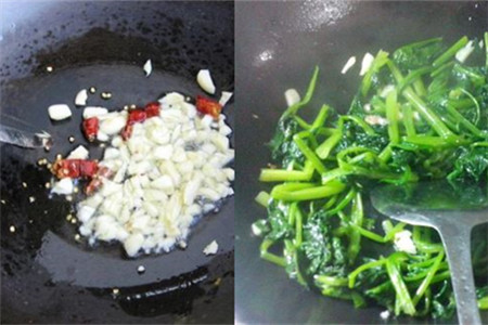 等菠菜要炒熟时,就放一点盐和味精进去,然后再翻炒均匀,就可以出锅了。我们在炒的时候要注意,因为菠菜烫过水,所以在炒的时候不用放太多的油,清淡一点的话,会更健康。还有就是在烫菠菜的时候,一定要放一点油在水里,这样烫出来的菠菜叶子才会嫩绿。我们先要把姜蒜倒进锅里炒,因为干辣椒容易炒糊。