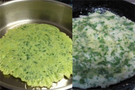 我们准备一口平底锅,在锅上面均匀的刷一层油,先开小火把锅预热。等锅预热后,就舀一勺面糊在锅里,我们可以转动锅,这样可以让面糊均匀的铺在锅上。我们需要静静的等待,等菠菜饼的一面煎黄后,就翻至另一面,慢慢煎,等两面均煎成金黄色时,就可以出锅了。在制作菠菜饼的时候,我们一定要开小火慢慢煎,不要把菠菜饼煎焦了。