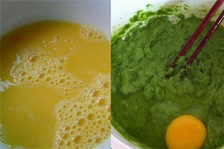 等菠菜完全冷却后,就把菠菜切细。我们再把榨汁机洗干净,然后把切好的菠菜放在里面,然后再添加一点水,把它打成菠菜汁儿。等菠菜汁打好后,就可以把它倒在一个大碗里。再把准备好的鸡蛋拿出来,根据菠菜的量,决定打几个鸡蛋,把鸡蛋打在菠菜汁里面,然后再加入盐和胡椒粉搅拌均匀。然后再加入适量的面粉,再搅拌均匀,直到搅拌成面糊止。