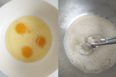 四、先用打蛋器的一档将蛋白打到出现大的鱼眼泡,将细砂糖倒入三分之一,换中档将蛋白打到出现小泡沫的时候,倒入三分之一糖。将打蛋器调至高档搅打,蛋白出现细腻的泡沫时,倒入剩下的三分之一砂糖。年轮蛋糕的蛋糕坯要较为柔软湿润,才比较容易卷成卷,所以蛋白打到湿性发泡即可。