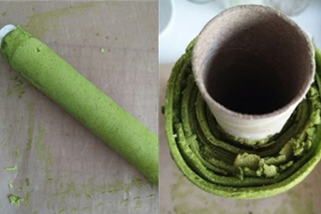 九、烤好的蛋糕坯尽快脱掉油布,晾凉以后切掉不规整的四边,用筷子或者擀面杖从下到上卷起,注意用力要均匀。当卷到三分之二处时,将另一片蛋糕坯放在上面,如此反复卷起后,用油布包裹定型。