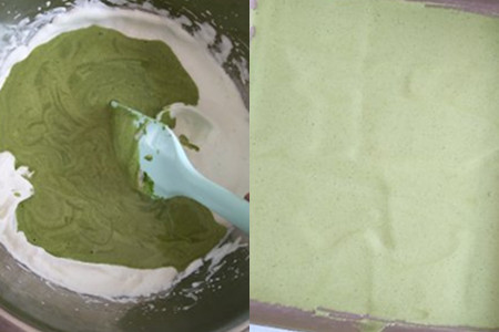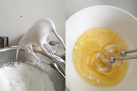 五、将三分之一打发好的蛋白糊舀入蛋黄糊,用类似炒菜的手法切拌均匀。动作要快速轻柔,避免蛋白消泡。