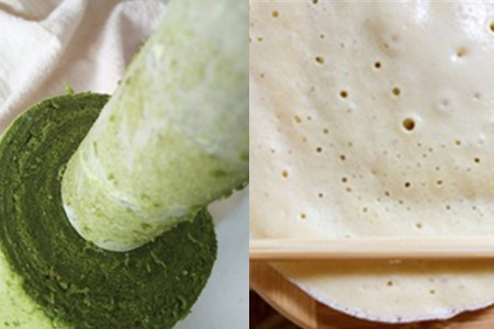 十一、平底锅制作蛋糕坯的方法更为简单,只要舀一勺蛋糕糊在预热好的平底锅中,转动将其摊平、煎熟即可,卷制方法同上。