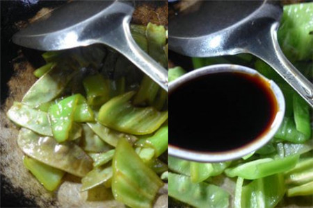 我们把焯好水的扁豆捞起来,然后立即用凉水冲洗,以此来保持扁豆翠绿的颜色。我们先开大火把炒锅预热,然后倒入植物油,等油烧热后,就可以把火转为小火,然后再放一点花椒炒香。等花椒炒香后,就可以开大火把青椒倒进锅里,一直炒到青椒变色,然后再倒一点老抽在锅中,翻炒均匀就可以了。我们再把扁豆放在青椒中,一起炒,炒熟后,放一点鸡精。