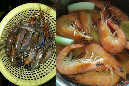 4、锅中的水再次沸腾后,再煮上三十秒钟便可用漏勺将其全部捞出。具体煮制的时间,要根据虾的个头和数量来决定。