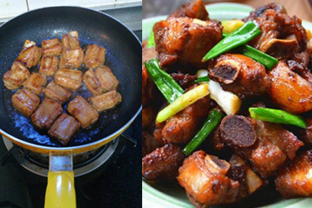 4、把炒锅冲洗干净,再用厨房用纸擦掉上面的水。把炒锅放在火上加入,把排骨下入锅中,煸炒至排骨的水分开始收干,开始出油后便可用锅铲盛出。