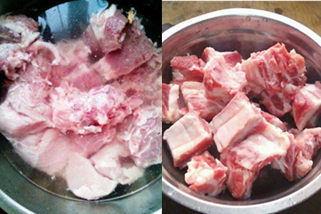 2、先将从超级市场买回的新鲜的排骨浸泡在清水里,以去除排骨上的污血。浸泡的过程中,要反复地更换清水。把泡好的排骨捞出摆在菜板上,用刀斩成小块状。