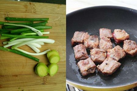 5、另起一口炒锅,将少量的食油倒入炒锅里。油温烧热一会后,把排骨全部倒入油锅里。淋上些许的白酒,把排骨反复翻炒出香味。紧接着撒上些食盐、白糖,淋上些酱油进行调味。翻炒均匀后,再淋些老抽,浇上少量的开水,盖上锅盖小火慢慢焖至锅中的汤汁开始变得浓稠。这时候加上之前切好的香葱段,搅拌均匀便可食用了。