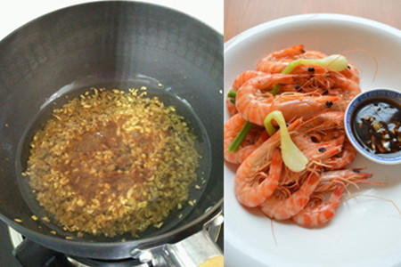 7、将少许的食油倒入炒锅里,油温烧热开始冒小泡后。把蒜末和生姜丝全部下入油锅里,撒上些食盐、白糖,这时候再淋上些生抽,用铲子翻动,加热至白糖和食盐融化后便可关火。取一口干净的小碗,把制作好的蒜姜汁倒入其中。鲜虾剥壳,蘸酱汁即可食用了。