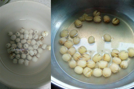 2、先将莲子事先浸泡在装有清水的小碗中,浸泡至其变软为止。将适量的清水倒入煮锅里,水煮开沸腾冒泡后。把浸泡软的莲子下入沸水里,大火煮上十分钟左右再捞出备用。
