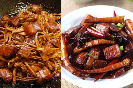 7、再把之前准备好的笋干放入炒锅中,倒入少量的清水,锅里的汤汁大火烧开后。把所有的食材倒入高压锅中,盖上锅盖炖上十五分钟。高压锅泄压后,把食材再倒回炒锅里,大火收汁完成后便可食用了。