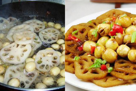 4、把葱白切成碎末状,摆在盘子里待用。将适量的食油倒入洗净的炒锅里,油温加热到五六成时。把葱白下入油锅里,小火用锅铲进行煸炒爆香。待葱香味开始挥发出来后,把莲藕片倒入锅中进行反复地翻炒。紧接着把煮熟的莲子和适量的清水倒入炒锅中,撒上些食盐、白糖,淋些醋、酱油。锅里的汤汁大火烧开冒泡后,改为中火继续煮至汤汁变得浓稠便可关火盛盘食用了。