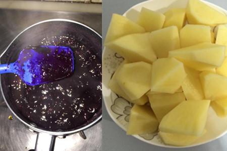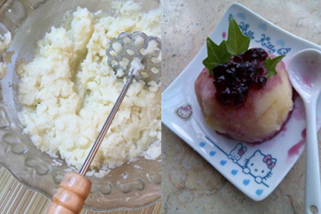 6、可以把土豆泥倒进裱花袋里,在盘子上挤出漂亮的花瓣。在上面淋上蓝莓酱,便可食用了。如果觉得麻烦,也可以随意做一个造型,在上面浇上蓝莓酱。