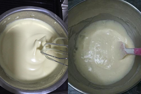 4、把黄油从冰箱中取出,待其在室温下融化后。把黄油倒入面糊里搅匀,放在旁边备用。