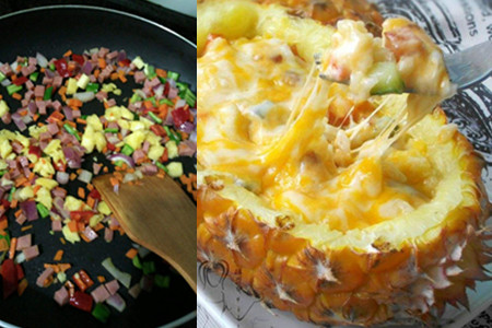7、把炒制好的菠萝饭盛进菠萝蛊里,在米饭上铺上些许的芝士片。把烤箱预热几分钟,把菠萝蛊放入烤箱中烤制十分钟便可取出食用了。